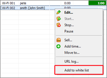 If you want to add a logged in Wi-Fi device to white list, use Add to white list terminal right click menu:
